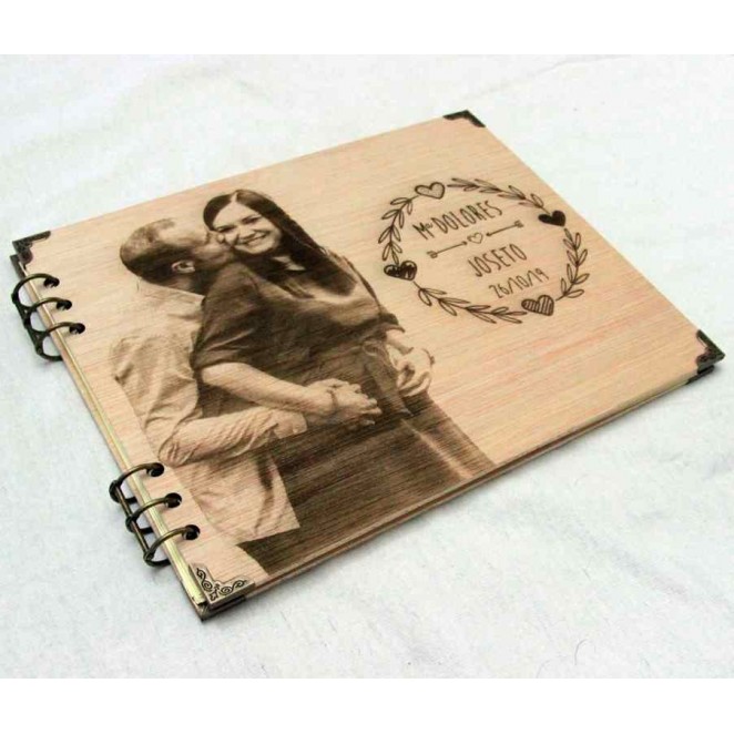 - Original álbum de fotos, hecho en madera, con foto y texto personalizado.